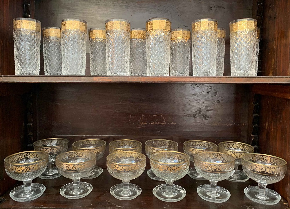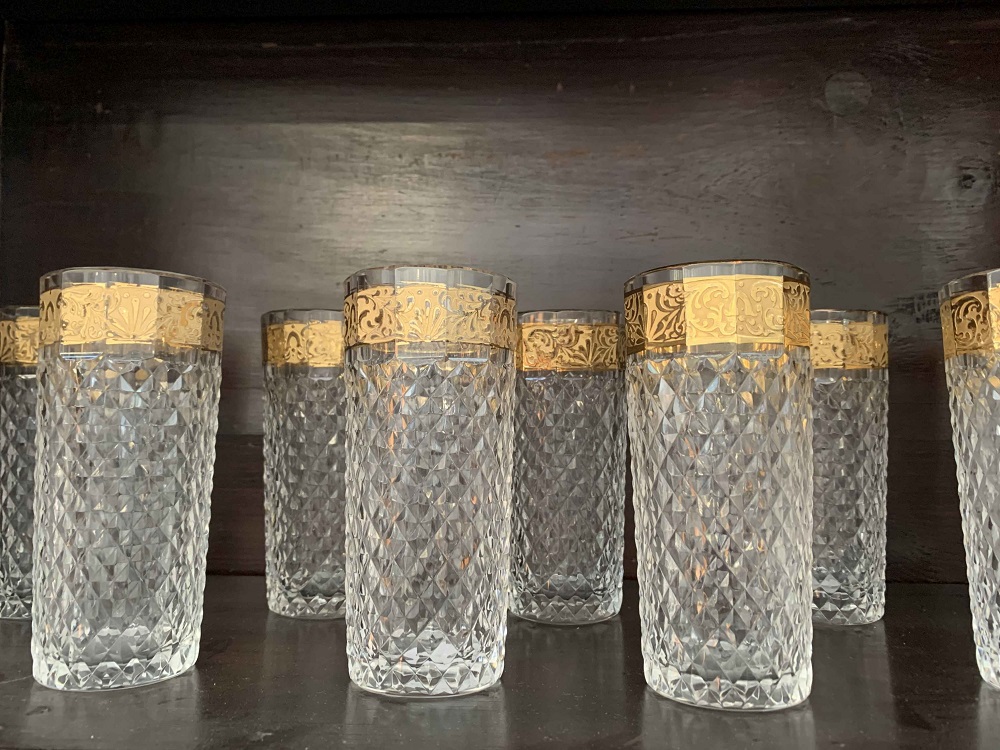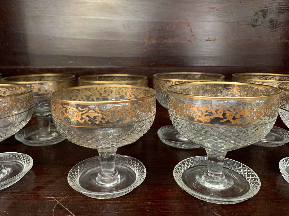 Lotto composto da ventiquattro tra coppe e bicchieri in vetro trasparente decorato a dorature (difetti)