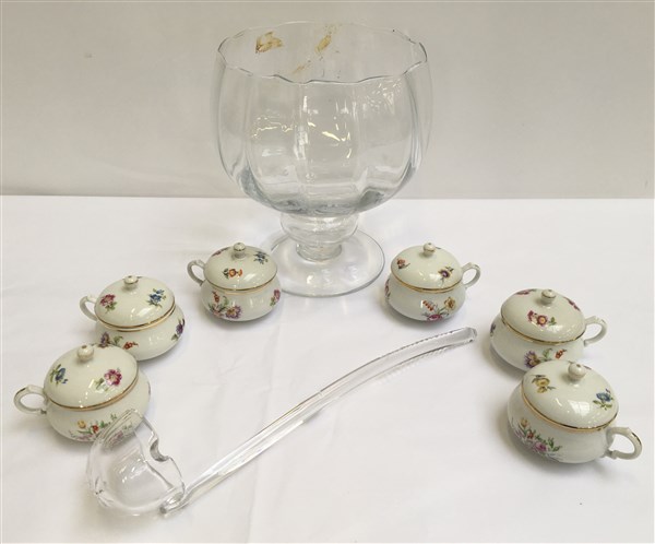 Lotto composto da sei tazze da puerpera Richard Ginori in porcellana decorata a mazzi fioriti e profilata in oro, unite ad una coppa da punch in vetro con mestolo (difetti)
