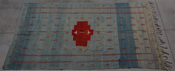 Decoro con medaglione rosso stilizzato con all'interno motivi della grande Madre in bianco su fondo di colore azzurro con numerose abrache, cosparso di motivi geometrici in rosso, giallo e verde realizzati con treme aggiunte durante la tessitura. (cm 320x177) (difetti)