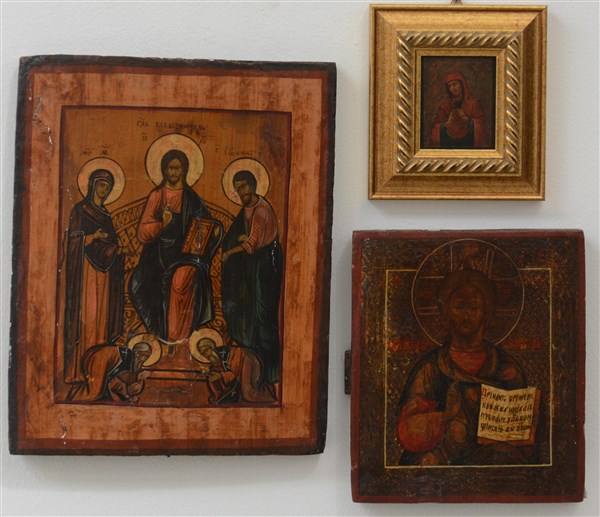 Lotto composto da tre icone ad olio su tavola di soggetti diversi, una in cornice (la più grande cm 26x21) Russia, secolo XIX (difetti e restauri)