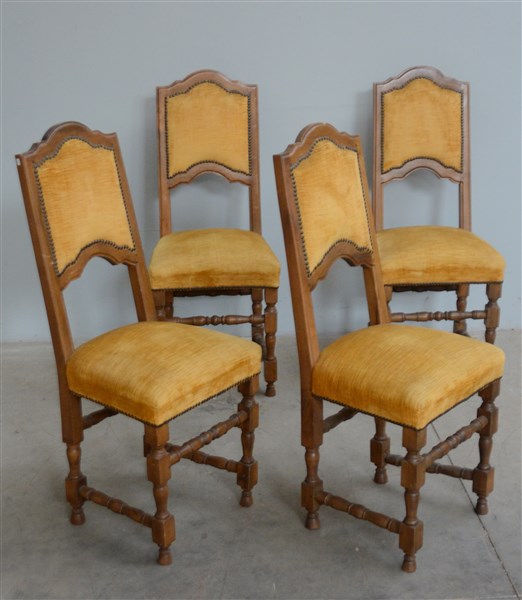 Gruppo di quattro sedie con gambe tornite a rocchetto, rivestite in velluto ocra (difetti)