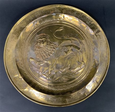 Lotto composto da un piatto in ottone sbalzato con figura di leone (d cm 51) ed