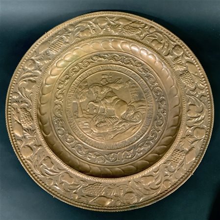 Piatto da parata in rame sbalzato decorato al centro con S.Giorgio e il Drago (d cm 64) (difetti)