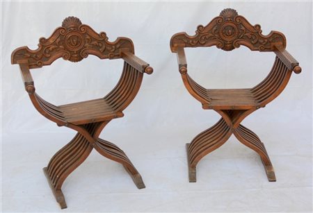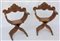 Coppia di savonarola con schienali in legno intagliato a volute e motivi foglia