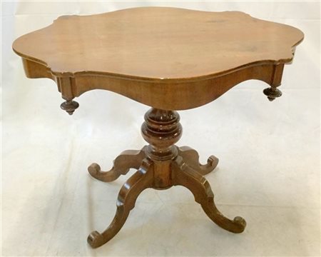Tavolino in noce con piano sagomato, gamba centrale tornita terminante a tre piedi mossi, secolo XIX (cm 100x77x70) (difetti e restauri)