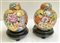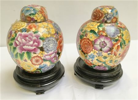 Due potiches in porcellana decorata in policromia a fondo dorato, basi in legno
