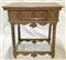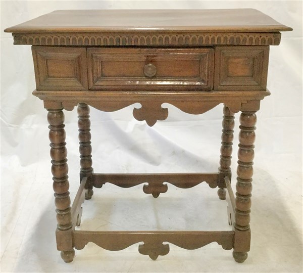 Tavolino ad un cassetto, fascia intagliata ad unghiature, gambe tornite riunite da traverse sagomate (cm 68x70x47) (difetti)