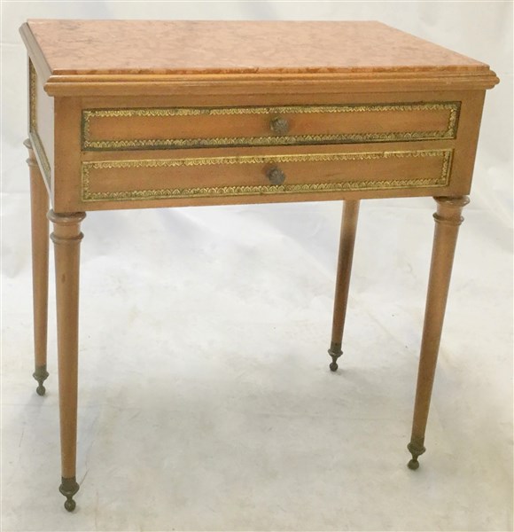 Mobiletto da centro a due cassetti e due finti cassetti decorati da profili in metallo dorato e cesellato, gambe tornite con puntali in metallo, piano in marmo (cm 69x75x44) (difetti)