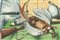 Gregorio Sciltian Dopo la caccia, 1969 Litografia su carta, cm. 50x70, es. 47/99 Firma in basso a destra, tiratura in basso a sinistra. Sul verso: etichetta "Il Geroglifico", Roma, con descrizione.