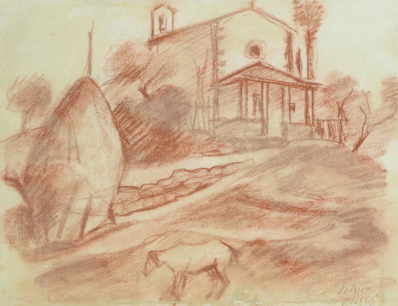 Silvio Pucci Paesaggio Sanguigna su carta, cm. 30x38 La carta presenta lievi imperfezioni in basso. Firmato in basso a destra.