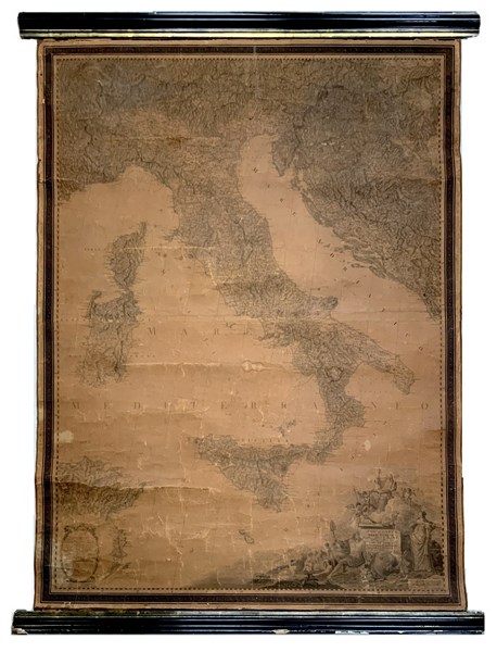 [CARTOGRAFIA - ITALIA] RIZZI-ZANNONI Giovanni Antonio (1736-1814). Nuova carta dell'Italia. Firenze, Molini, 1802 (ma 1816). Carta murale intelaiata (1250 x 930mm) con supporti coevi. Edizione ricorretta del 1816 di questa importante mappa della penisola italiana. (fortemente brunita e con piccole mancanze)
