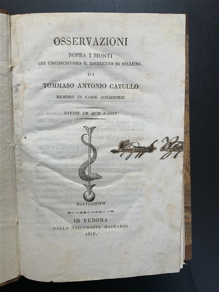 CATULLO, Tommaso Antonio. Osservazioni sopra i Monti che circoscrivono il distretto di Belluno. Verona: Mainardi, 1818. 8vo, mezza pelle coeva su carta marmorizzata (alcuni difetti). Non collazionato e difetti da esaminare.