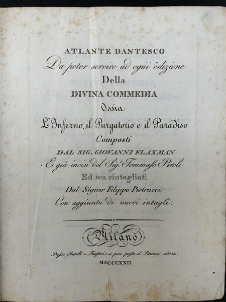[DANTE ALIGHIERI] FLAXMAN Giovanni. Atlante dantesco. Milano: Batelli e Fanfani, 1822. 4to, doppio frontespizio calcografico, in italiano e francese, introduzione, 118 (su 120) tavole di gusto neoclassico incise dal Pistrucci (sporadiche fioriture) Legatura coeva in mezza pelle con titolo in oro su tassello al dorso (lievi difetti)