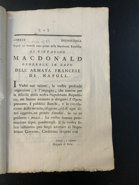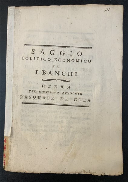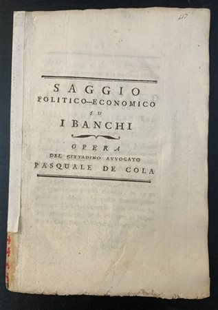 [ECONOMIA] DE COLA, Pasquale. Saggio politico-economico su i banchi. 1799. 4to, 14 carte, privo di legatura (foro di tarlo al margine inferiore). Rarissimo pamphlet dedicato al generale Macdonald in cui l'autore propone un piano per ridurre l'inflazione galoppante nel regno di Napoli eliminando progressivamente i "biglietti e i fogli creditizi", ovvero riducendo l'offerta di moneta.