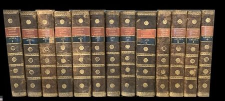 FERRARIO, Giulio. Il costume antico e moderno. Torino: Alessandro Fontana, 1831. 26 volumi con numerose tavole illustrate, 4 volumi dedicati alle Americhe, 3 all'Africa, 6 all'Asia e 10 tomi in 13 volumi dedicati all'Europa. 8vo, pelle coeva con dorso decorato in oro e etichette in pelle con titolo e numero del volume (mancano alcune etichette al dorso) (difetti). Non collazionato e difetti da esaminare. [26]