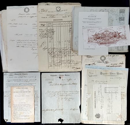 [MILANO - EDITORI - TIPOGRAFIE] Lotto di documenti, ricevute e fogli pubblicitari di editori e tipografie del XIX secolo tra cui Artaria e la tipografia Elvetica