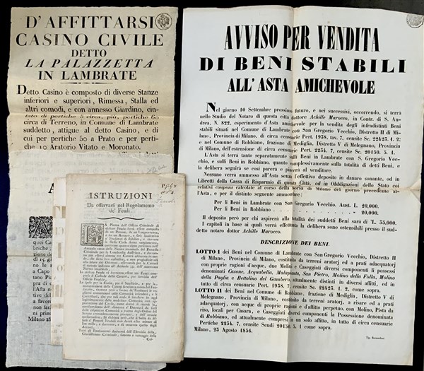 [MILANO - GRIDA E AVVISI]. Una serie di grida e avvisi di vendita perlopiù del XVIII-XIX secolo, numerosi dedicati a proprietà in vendita in zona Lambrate
