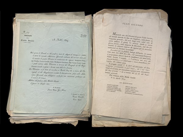 [MILANO - NOBILE SOCIETA'] raccolta di circolari, comunicazioni e lettere inviate alla famiglia Greppi relative alla Nobile società, più tardi Casino dei Nobili a San Giuseppe di Milano. Le carte vanno dalla riapertura della società nel 1815, quando venne acquistata la sede di Palazzo Talenti Fiorenza in via Verdi, alla liquidazione del Casino nel 1851-53. Un'interessante panoramica sul più esclusivo ed elitario dei club milanesi che riuniva solamente le personalità ammesse a corte e che richiedeva dei salatissimi costi associativi. Il declino di quest'istituzione vide il sorgere dei due club esistenti ancora oggi: La società del giardino e il Circolo dell'Unione.