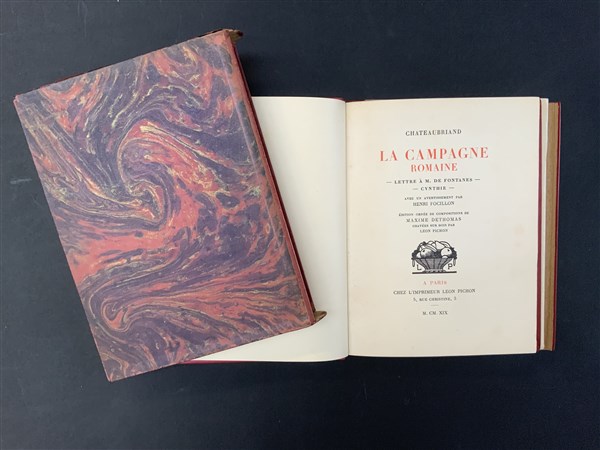 [PICHON] - CHATEAUBRIAND, Francois-Rene de. La campagne romaine. Lettre a M. de Fontanes. Cynthie. Parigi: Leon Pichon, 1919. Uno dei più pregiati esamplari in antica carta giapponese in pregiata legatura in marocchino rosso entro portfolio e cofanetto appositamente fabbricati. Esemplare n. 25 con suites aggiuntive di tavole