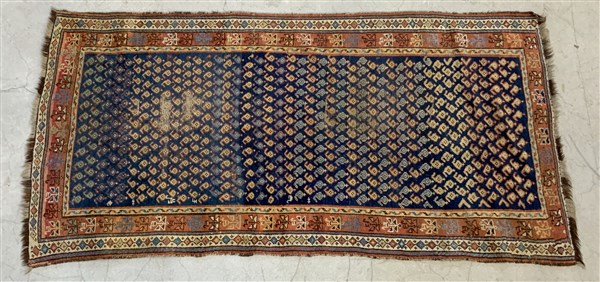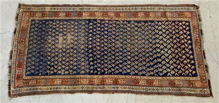 Tappeto Gandjè, Caucaso, inizio secolo XX, decoro con file di Boteh su fondo blu. (cm 209x107) (Difetti e rapature)