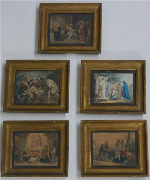 Gruppo di cinque stampe a colori del sec. XIX raffiguranti scene dalla vita di Cristo e il ciclo della vita (cm 19x24) in cornici coeve (difetti)