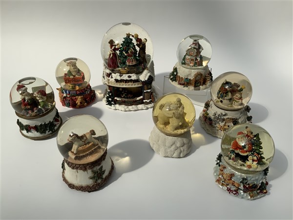 Gruppo di otto boules de neige con carillon a tema natalizio. Vetro e resina policroma (h max cm 23) (difetti e mancanze)