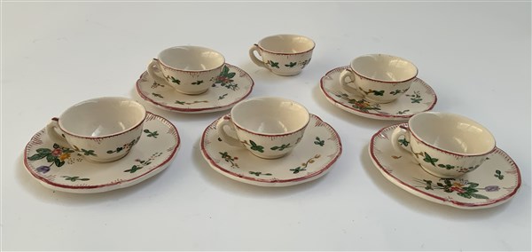Servizio da caffè mignon in maiolica con decoro a fiori composto da sei tazzine e sei piattini (lievi difetti)