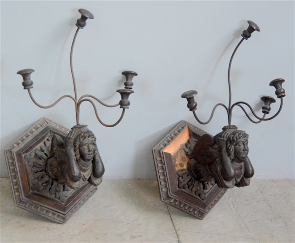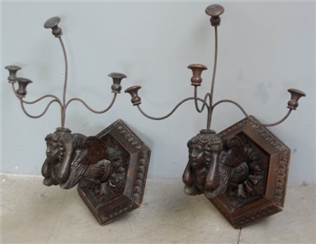 Gruppo di quattro appendiabiti in legno intagliato a figure femminili alate con braccia in metallo e legno. Secolo XIX-XX (cm 37x32x30) (difetti e mancanze)