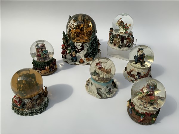 Gruppo di sette boules de neige con carillon a tema natalizio. Vetro e resina policroma (h max cm 23) (difetti e mancanze)