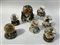 Gruppo di sette boules de neige con carillon a tema natalizio. Vetro e resina p