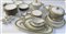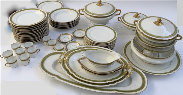 Manifattura francese Limoges. Parte di servizio di piatti in porcellana bianca con decoro verde e oro composto da: venti piatti piani, sette piatti fondi, dieci piatti da frutta, una zuppiera grande, due zuppiere piccole, due alzate diverse, quattro piatti da portata diversi, due antipastiere, una salsiera, dieci tazzine da caffècon nove piattini (lievi difetti)