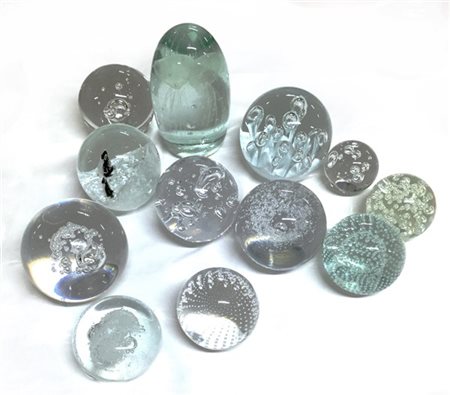 Lotto composto da dodici presse-papiers in vetro incolore di diversa fattura, alcuni firmati (lievi difetti)