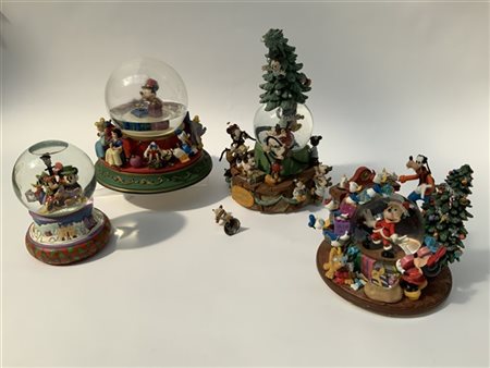 Quattro carillon Disney con snow globe a tema natalizio. Vetro e resina policroma (h max cm 32) (gravi difetti e mancanze)