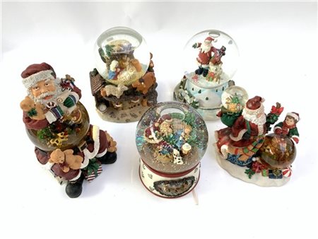 Gruppo di cinque boule de neige natalizie. Vetro e resina policroma (h max cm 22) (difetti)