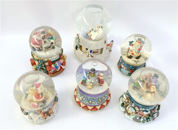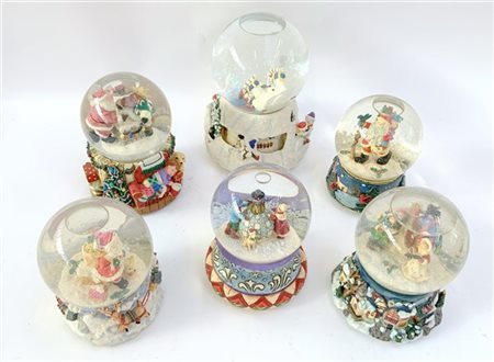 Gruppo di sei boule de neige natalizie con carillon. Vetro e resina policroma (h max cm 20) (difetti)