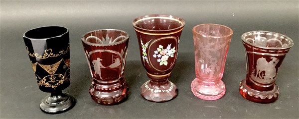 Manifattura di Boemia, lotto di cinque bicchieri con decori incisi e dipinti (h