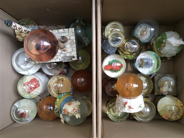 Lotto di due cartoni contenenti numerose boules de neige di soggetti e dimensioni e materiali differenti. (difetti)