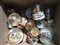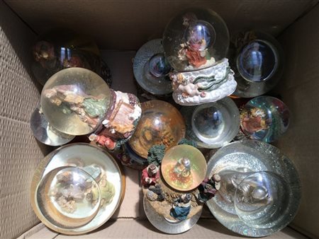 Cartone contenente numerose boules de neige a tema natalizio di dimensioni differenti. Vetro e resina policroma (difetti)