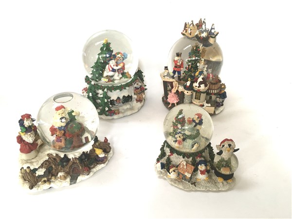 Gruppo di quattro boules de neige a tema natalizio di cui tre con carillon. Vetro e resina policroma (h max cm 25) (difetti e restauri)