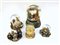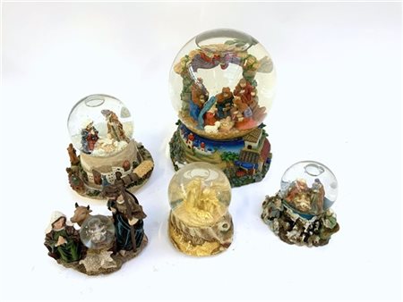 Gruppo di cinque presepi con boule de neige di cui tre con carillon. Vetro e resina policroma (h max cm 24) (difetti)