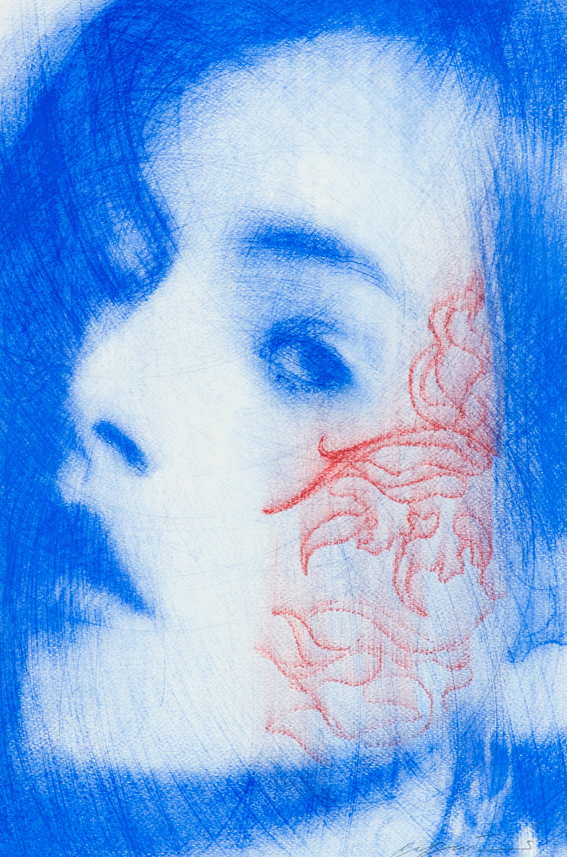 Omar Galliani Blù, soltanto blù Pastelli policromi su cartoncino, cm. 48x32 Firmato in basso a destra. Sul verso: firma e titolo. Autentica dell'Artista su foto.