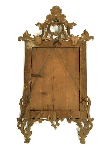 Antica specchiera in legno intagliato, traforato e dorato, pendenti di foglie e fiori (cm 55x100) (difetti e mancanze)