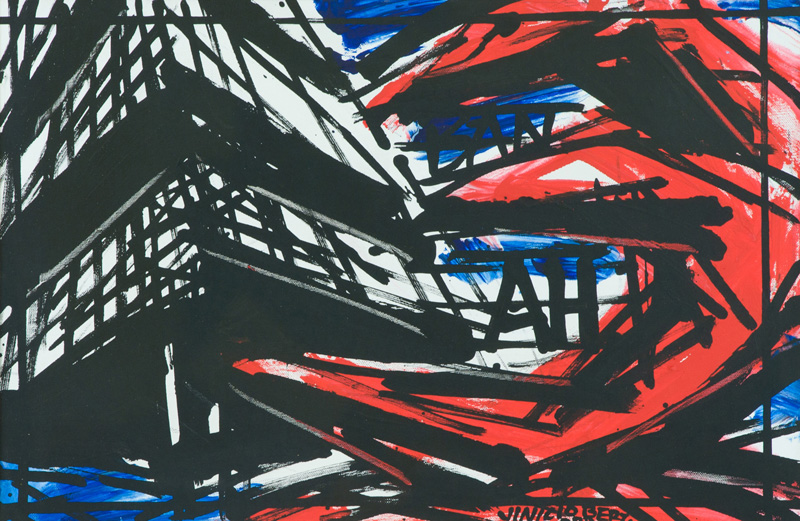 Vinicio Berti Incontro AH positivo, 1988 Tempera sintetica su tela, cm. 40x60 Firma e data in basso a destra. Sul verso: firma, data, titolo e dedica a persona.