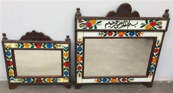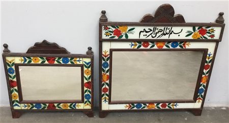 lotto di due specchiere orientali con bordi in vetro decorati a fiori, una con iscrizione araba