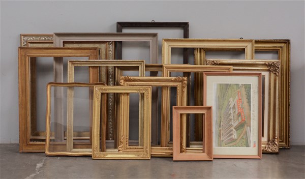 Lotto composto da quindici cornici in legno di diversa misura e decoro (difetti
