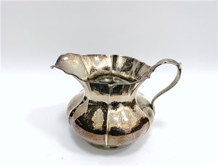 Brocca in argento con corpo martellinato decorato a nervature, titolato 800 e recante simbolo dell'argentiere. (gr 500)