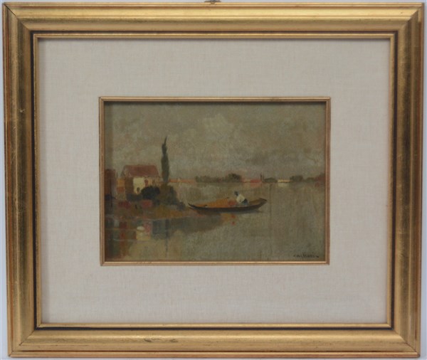 "Paesaggio lagunare" olio su masonite (cm 14,5x19,5) Firmato in basso a destra. In cornice