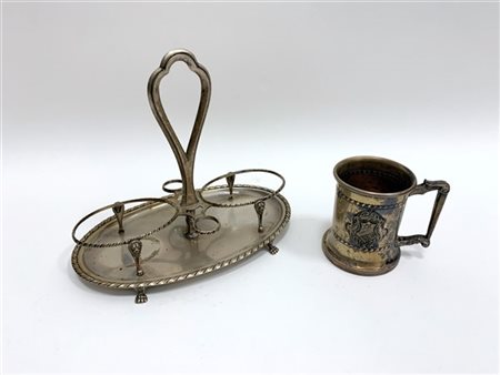 Lotto composto da un porta-ampolle ed un piccolo boccale cesellato con stemma nobiliare, in argento titolo 800 (gr 400) (lievi difetti)