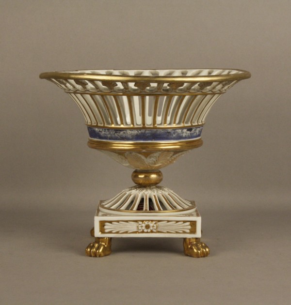 Firmato, datato. Alzatina a cesto in ceramica con decori in oro. Periodo Impero. Difetti e restauri. Mis. Alt. cm. 18 Diam. cm. 21 ca.