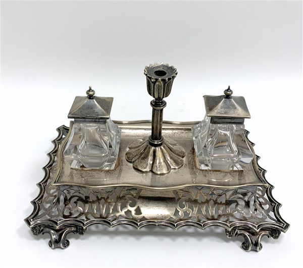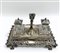 Calamaio in metallo argentato con base traforata, boccette in vetro e piedini a ricciolo (difetti)